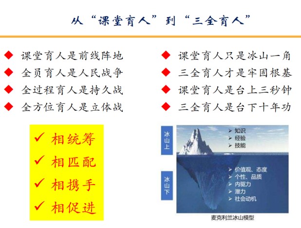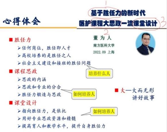 分享会中,朱老师以研修班主题“基于胜任力的新时代医护课程大思政一流课堂及其设计”为切入点,指明打造“大思政”格局,是事关“培养什么人、如何培养人、为谁培养人”这一根本性问题。利用“冰山模型”生动形象地讲透、讲活了新时代课程思政关注的不仅仅是知识和技能,更要培养学生“水面下”的部分,培养学生的批判性思维,使之具备技术技能型人才胜任力,进而契合学校应用型、特色性、国际化的办学定位。进一步结合自己讲授的“突发应急事件管理”这一课程,生动地示范了传授知识与价值引领相结合的过程。最后,朱老师以晚自习辅导这一活动为例,分享了如何从“课堂育人”走到“三全育人”,以润物细无声的巧妙方式将思政元素与学生职业生涯规划深度融合,达到“在教师引导下的学生自主思考”的良好效果。