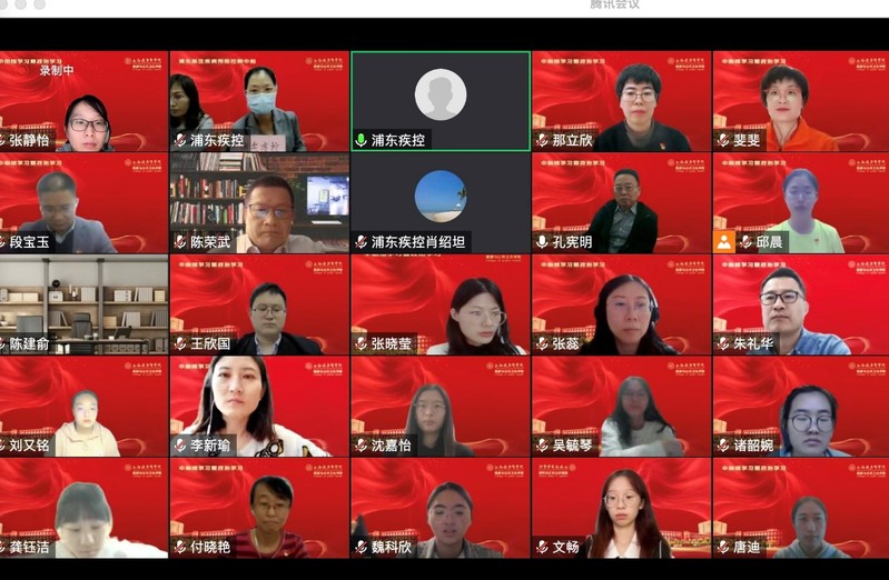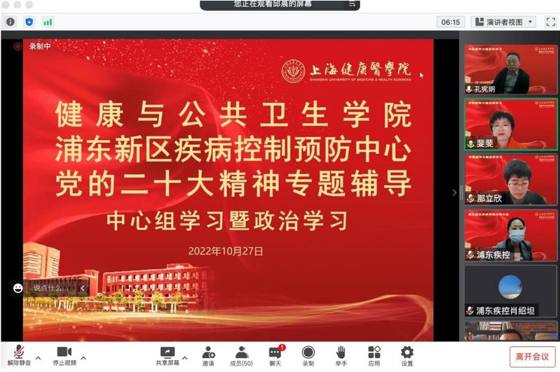 最后,顾斐雯书记做总结发言。她表示,中华民族伟大复兴是不以人的意志为转移的历史潮流方向,而这一由历史动能驱动的快车不会等待一切犹豫者和懈怠者。作为一名党员,必须时刻牢记初心使命,时刻围绕党的二十大提出的中心大局工作主线,自觉在大局下思考、在大局下作为、与历史同步伐、与时代共命运。作为卫生健康行业的一员,我们要向浦东新区疾控的同仁们学习,学习在疫情防控中无私奉献、服务大局的大无畏精神;作为医学院校的师生,我们要树立梦想从学习开始、事业靠本领成就的观念,努力提升为人民健康服务的技能本领,为健康中国建设、重大疫情防控、中医药传承创新发展、医药卫生体制改革贡献力量!