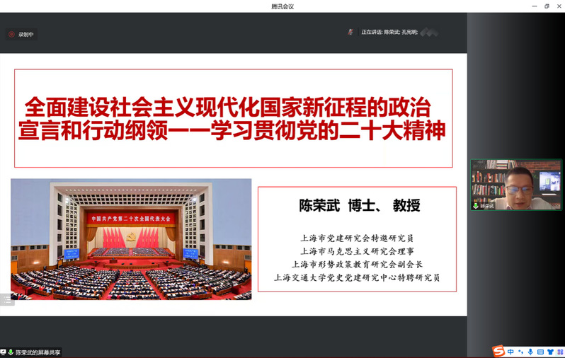 接着,上海市党建研究会特邀研究员陈荣武教授应邀作了题为《全面建设社会主义现代化国家新征程的政治宣言和行动纲领——学习贯彻党的二十大精神》的专题辅导报告。