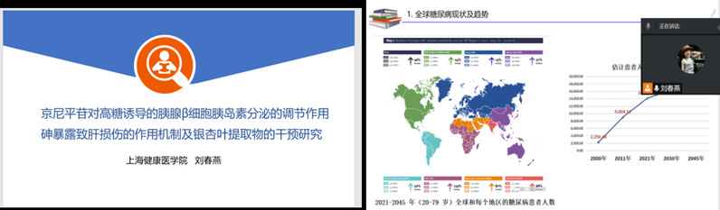首先,刘春燕老师分享了她硕士、博士期间的研究内容以及接下来的研究计划,硕士期间研究内容为京尼平苷对高糖诱导的胰腺β细胞胰岛素分泌的调节作用,她介绍了2型糖尿病的现状、京尼平苷调节胰岛素分泌的分子机制。博士期间研究内容为砷暴露致肝损伤的作用机制及银杏制剂的干预作用,重点分享了砷暴露致肝损伤的作用机制。刘老师指出当前感兴趣的方向主要是从表观遗传角度,探讨维生素D缺乏致2型糖尿病的分子机制。