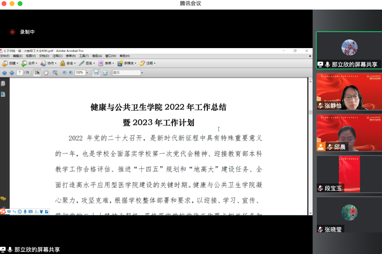 1月10日上午9点半,正式会议开始,会议在雄伟庄重的国歌声中拉开帷幕。大会听取了那立欣副院长作《新葡的京集团35222vip2022年度工作总结暨2023年度工作计划》。学院在党建引领、专业建设和人才培养、学科建设与科学研究、师资队伍建设等方面,建框架、搭平台,学院发展稳步向前。2023年将以本科合格评、食品卫生与营养学及公共事业管理专业评估为抓手,在教学、科研、实验室建设等方面再上一个新台阶。