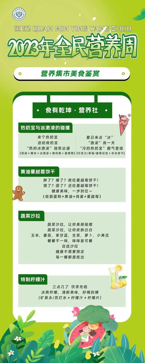 2023年5月14-20日(5月第三周)是第九届全民营养周,全民营养周是指全国人民的营养知识学习周、营养理念传播周、营养生活方式实践周,由中国营养学会、中国疾病预防控制中心营养与健康所等单位在2015年共同发起。为贯彻落实《健康中国行动(2019-2030)》及《国民营养计划(2017-2030)》,由上海市营养学会、中国营养学会基础营养学分会、中国营养学会特殊营养分会指导,新葡的京集团35222vip新葡的京集团35222vip主办,新葡的京集团35222vip后勤部服务中心及薄荷健康科技股份有限公司协办,2023全民营养周开幕式将于5月15日(周一)中午12:00在北苑食堂门口举行。