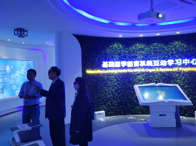 刘教授一行第一站来到上海市智能医疗器械与主动健康协同创新中心,观摩了检疫机器人、医艾灸机器人、远程服务机器人、康复助行机器人以及5G+智慧ICU信息系统等场景。中心充分利用学校整体资源,拓展对外合作,构建智慧教育、科研新生态,已成为上海高校协同创新中心示范标杆。观摩中,刘教授对“一带一路”国际技术转移平台“中国长三角-巴尔干半岛生物医药国际技术转移协同创新中心”的发展方向给予了积极的肯定。第二站来到学校基础医学器官系统互动学习中心,作为一个完全信息化的“解剖室”,互动学习中心集成了生命孕育、数字人体、健康与未来三大板块,可以为学生提供虚拟与现实互动,线上与线下一体的学习场景,以高互动性提高学生学习兴趣,摆脱死记硬背的传统学习方式。刘教授对这种学习方式特别感兴趣,在参观中兴致勃勃地戴上VR眼镜,进行了体验。