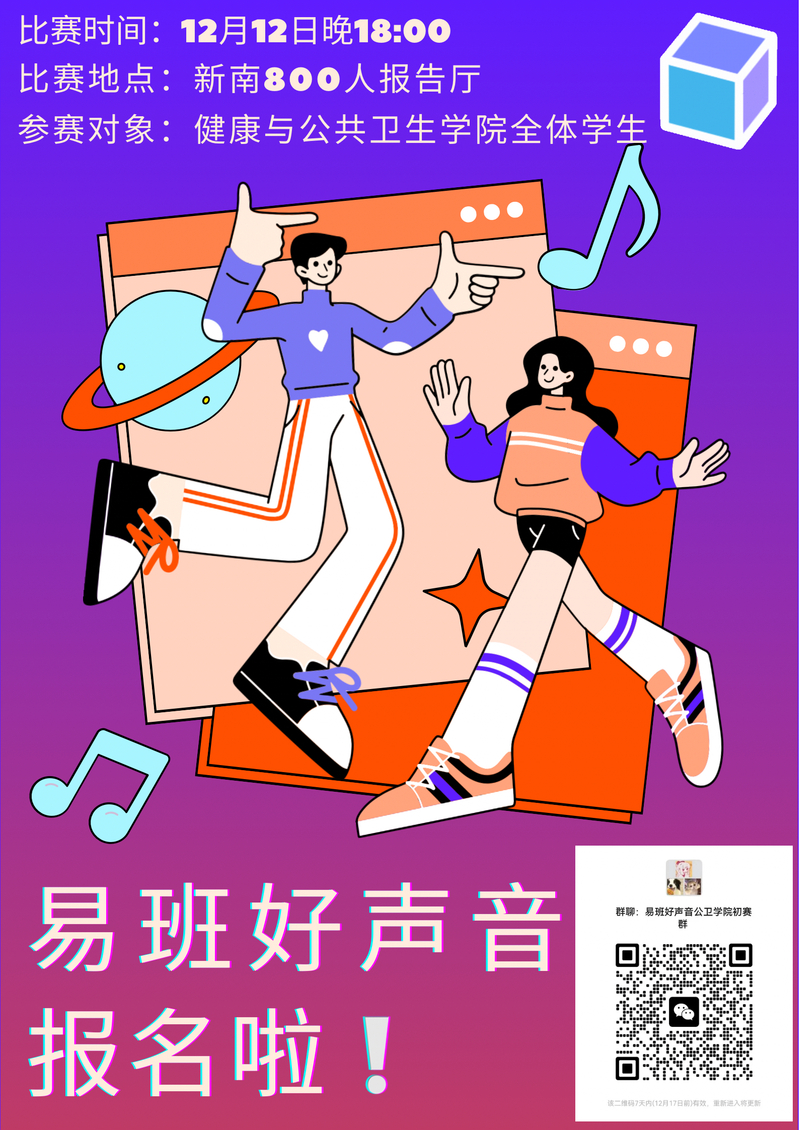 青春逐梦,唱响未来,为营造浓厚校园文化氛围,弘扬主旋律,传播正能量,让同学们能够更好展示自我,校易班开展“易班好声音”活动。新葡的京集团35222vip学生会将于12月12日晚18:00,在新南苑800 人报告厅开展初赛选拔活动。本次活动旨在通过歌唱的方式,让青春的旋律响彻校园,希望的种子扬帆起航,让上健医学子展现独属于他们的魅力。