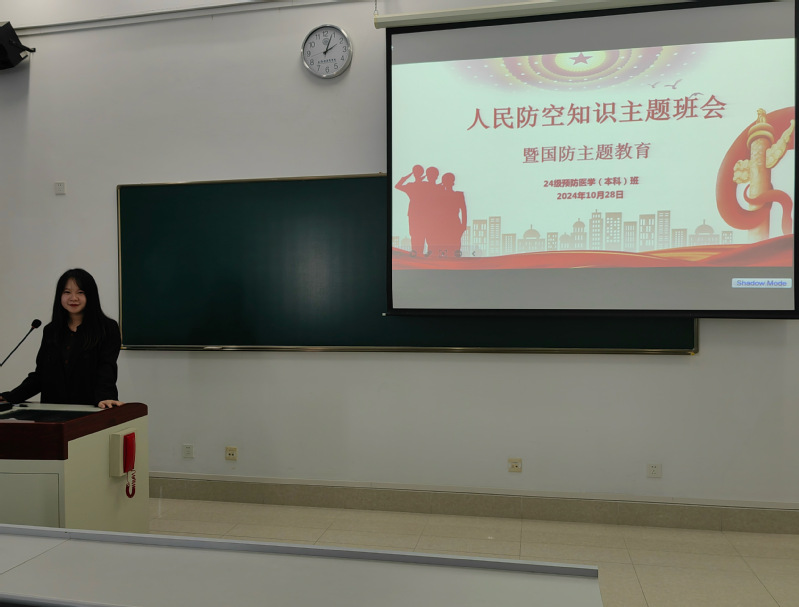 10月28日,2024级预防医学(本科)班于东苑北楼203开展人民防空知识主题班会暨国防主题教育。班会从人防、国防的定义说起,再到现代人防体系的重要意义,最后讲解相关案例,层层深入,让同学们对人民防空有了更加全面的了解,激发了学生的爱国热情。