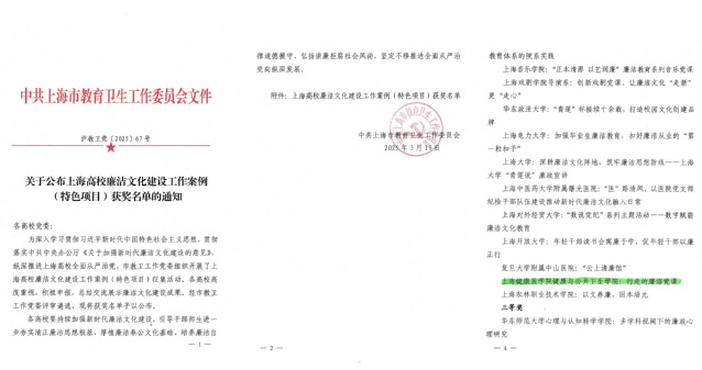 近日,上海市教卫工作党委公布了2024年度上海高校廉洁文化建设工作案例评选结果,我校新葡的京集团35222vip申报的《行走的廉洁党课》项目荣获上海高校廉洁文化建设工作案例(特色项目)评选中荣获二等奖,也是我校首次在该项目中获奖。