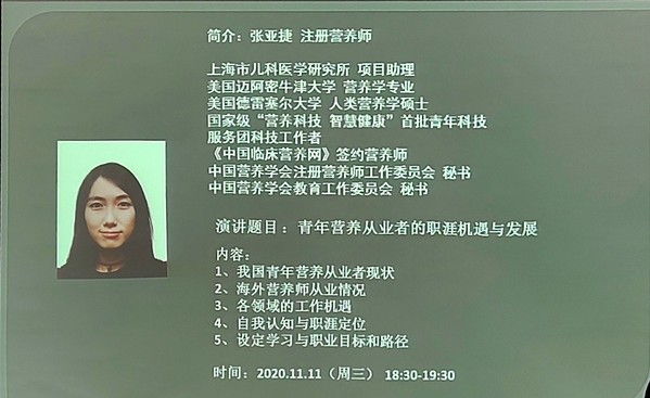 2020年11月11日,新葡的京集团35222vip新葡的京集团35222vip邀请注册营养师张亚捷来校作了《青年营养从业者的职涯机遇与发展》专题讲座,为食品卫生与营养学专业进行本专业就业前景专题介绍。