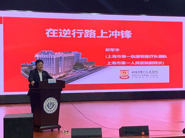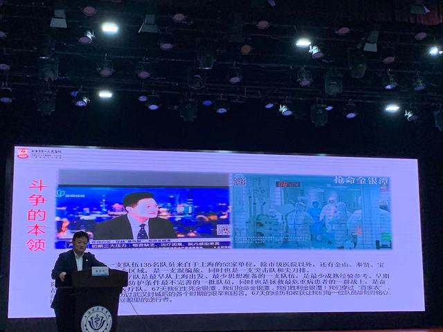讲座中,郑医生向同学们分享了疫情期间援鄂队伍出发去武汉之前的心理历程,以及医院内医护人员与病人之间的暖心瞬间,社会各层人士的激励片段。郑医生谈到第一批援鄂医疗队伍有三个核心:第一是组织的威力,医护人员的战斗力源于组织力,在最危难的时候,钟南山院长高龄出征,张文宏医生提议让共产党员先上!第二是斗争的本领,67天的逆行者,在防护物资缺少、防护条件简陋的情况下,面对病毒,每位医护人员使出各自的本领,让病人保持乐观的心态、必胜的决心。第三是牺牲的精神,上海援鄂医疗队的白衣战士执针在抗疫战场,“不计报酬、无论生死”,将个人安危、家庭亲情于第二位。很多老党员把危险留给自己,把安全留给别人。第四是信念的力量,每位医护人员不忘初心,牢记使命,把病人优先放在第一位,“救死扶伤”的理想信念支撑着医护人员在67天中保持着昂扬的战斗状态。