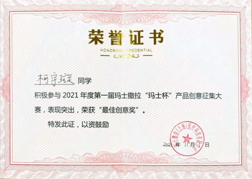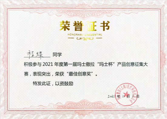2021年6月,由玛士撒拉(上海)医疗科技有限公司主办的第一届玛士撒拉“玛士杯”产品创意征集大赛顺利举办。新葡的京集团35222vip的同学们积极参加了本次大赛,最终经过公司评审组评选,《控能酸奶冰淇淋》项目获得了本次大赛 “最佳创意奖”。