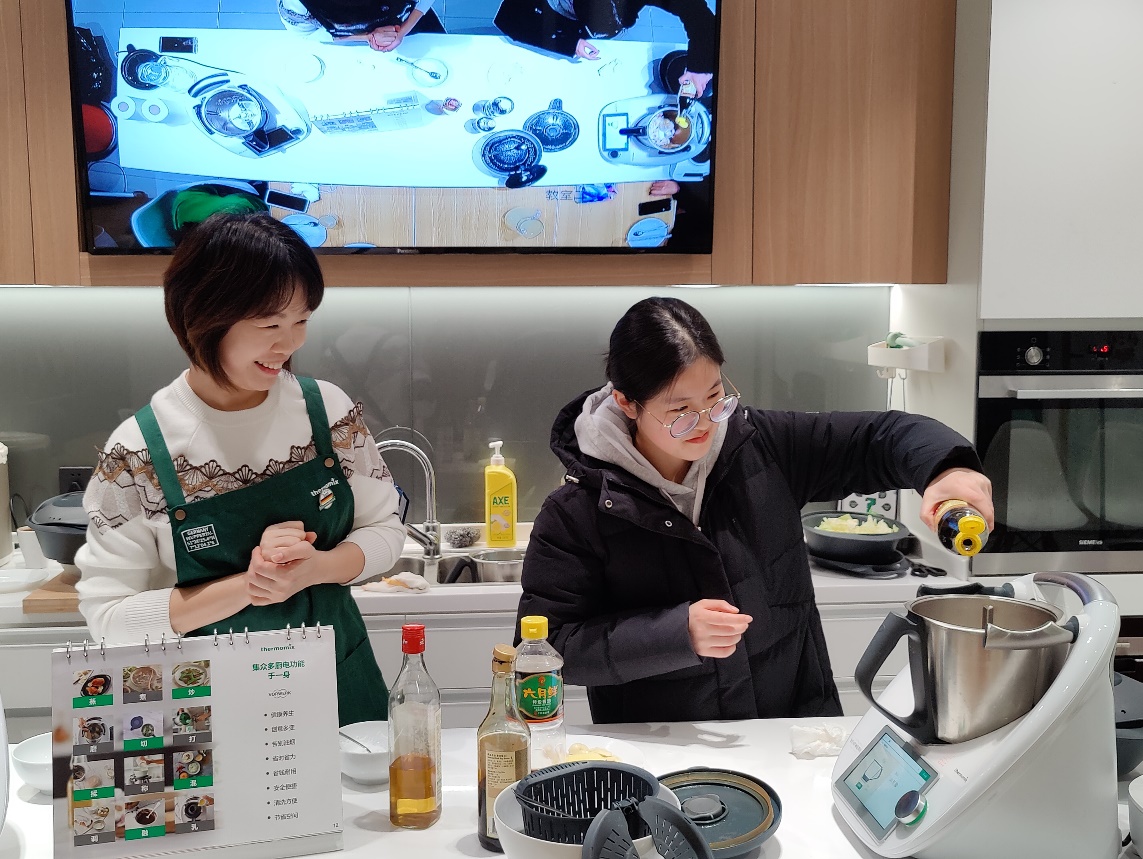同学们在门店现场对美善品的产品结构、功能、菜谱等进行了全面清晰的了解,并跟着美食顾问和机器提示一步步亲自体验,真实体会智能料理机的便捷,以及做菜效率的大幅提高。当天中午大家品尝了智能料理机制作的刀切馒头、手撕包菜、糖醋小排等5道菜以及两个健康饮品,大家对口味进行了比较,并对营养搭配知识进行了探讨。