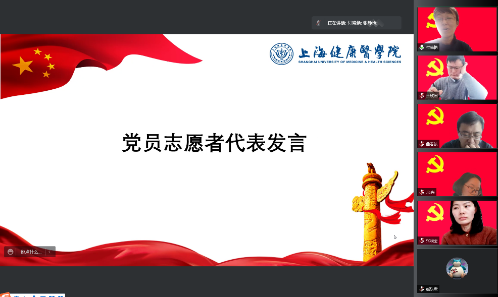 陈泓书记进一步向所有人介绍校内师生、浦东疾控的师生情况,对全体党员提出必须挺身而出,勇于担当,防控疫情是头等大事,密切关注权威渠道,不信谣不传谣,做好防疫工作的宣传员,同时关心学生的身心健康,多沟通多交流。 随后由三位党员志愿者代表邱晨、刘春燕和付晓艳进行发言。
