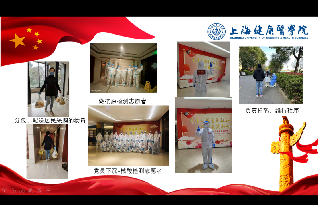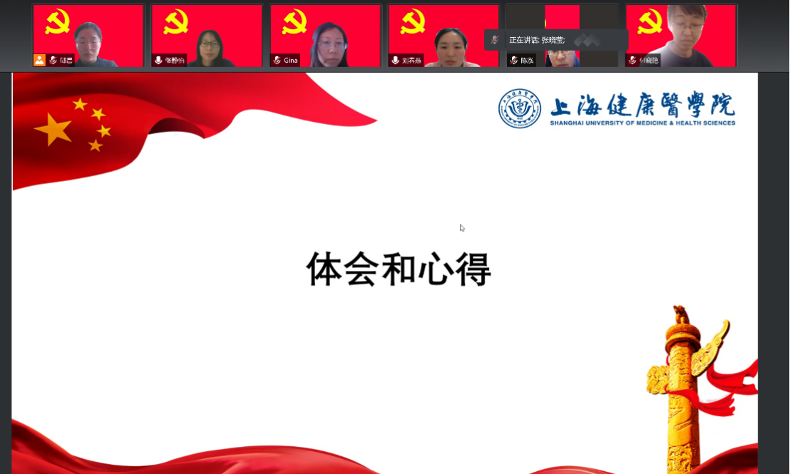 其他党员纷纷发表体会和心得。张晓莹老师在疫情期间不忘贡献出自己的力量,她积极报名给医务人员子女做晚托辅导的活动,已经设计了课程准备录制。王欣国老师在家里除了完成在线教学外,潜心研究公共事业管理专业建设,他表示虽然疫情隔离在家但是所有的工作都不能停,对上海动态清零的决心与信心绝不动摇。张蕊老师的爱人站在抗疫的第一线,张老师一个人既要照顾小家,还要完成日常工作,同时为学校抗疫志愿者做工作指导。李家兴老师亲身经历过武汉的疫情,在线上给予大家支持、鼓励与防疫妙招。张静怡老师这段时间与教研室的教师们每周四晚给学生进行辅导,督促在疾控中心做志愿者的同学们认真完成学习,对于本科评估的内容也是不断完善。运用自己的专业所长,参与起草楼栋管理须知,为小区疫情防控贡献出自己的力量。赵乐宏老师已经在浦东疾控中心与志愿者学生一起工作一个多月,事事尽心尽力,同时时刻关注学生的心理与生活。这段时间那立欣院长在浦东疾控中心陪伴学生,更加让赵老师和同学们安心、放心。