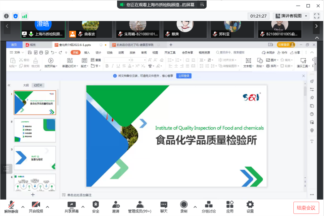 2021年6月21号下午,新葡的京集团35222vip邀请上海市质量监督检验技术研究院顾澄皓、朱伟两位专家为食品卫生与营养学专业的全体教师有关食品化学品质量检验研究的讲座。新葡的京集团35222vip食品卫生与营养学学21级学生共同参与此次讲座。