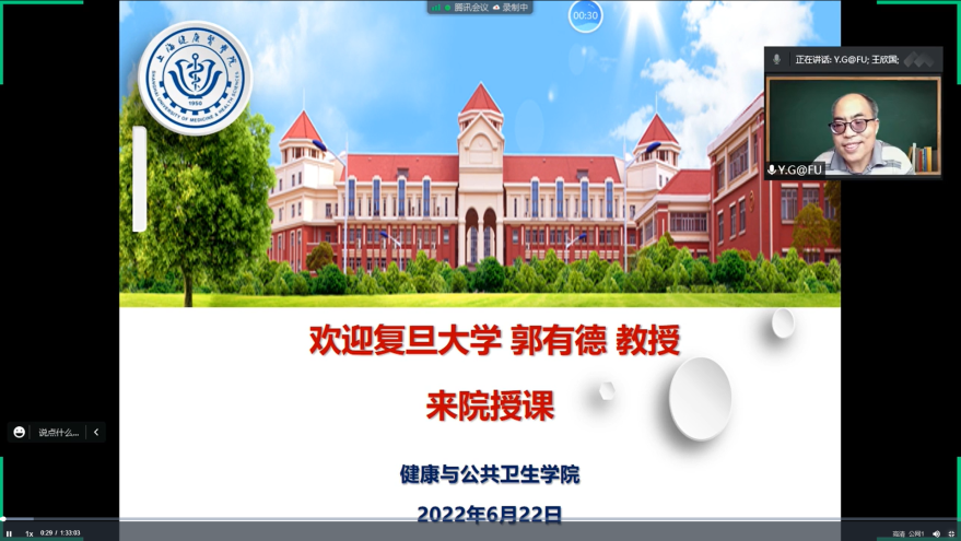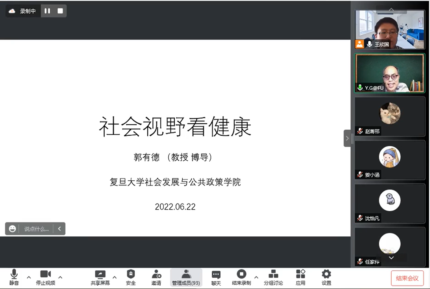 健康是人类永恒的追求,作为诞生于“健康中国”新时代的一所应用技术型本科医学院校,学校定位于“应用型、特色性、国际化”,以为新时代中国特色社会主义健康卫生事业发展培养高素质医学人才为己任。为提升学院教师科研水平,创造条件搭建科研合作平台,拓宽师生的视野, 6月22日14:00,新葡的京集团35222vip邀请复旦大学社会发展与公共政策学院郭有德教授线上开展学术讲座,2020级、2021级公共事业管理专业本科生,公共事业管理教研室教师等100余人参加了活动。