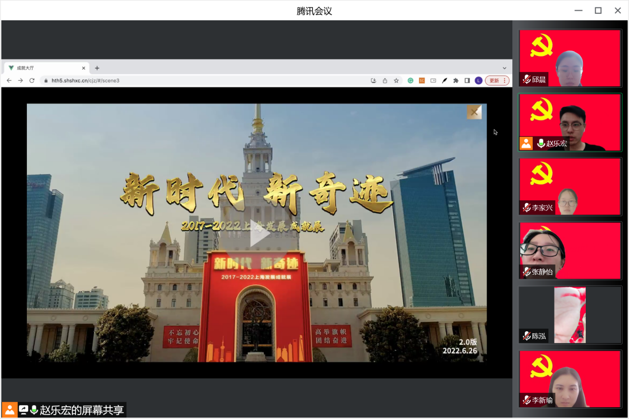 根据上级指示要求,深入关于组织学习“新时代 新奇迹·2017-2022”上海发展成就展线上观展学习活动,切实将参观主题展览作为学习宣传贯彻市第十二次党代会精神的重要抓手,围绕展览内容精心策划,组织丰富多彩的学习活动。为此,新葡的京集团35222vip党支部积极响应上级号召,于8月25日开展了集中交流,会议由赵乐宏老师主持,党总支书记陈泓、副院长那立欣及全体党员参加了本次学习活动。全体党员通过视频学习“新时代 新奇迹·2017-2022”上海发展成就展,回顾了五年以来总书记对上海的嘱托以及上海在以习近平同志为核心的党中央指引下所取得的各项成就,更为清晰地领略了上海这五年走过的历程。交流过程中,大家表示自己是这五年发展的亲历者、见证者和参与者,一致认为要将这次学习作为学习贯彻上海市第十二次党代会精神的重要依托,坚持立德树人,紧跟上海脚步。